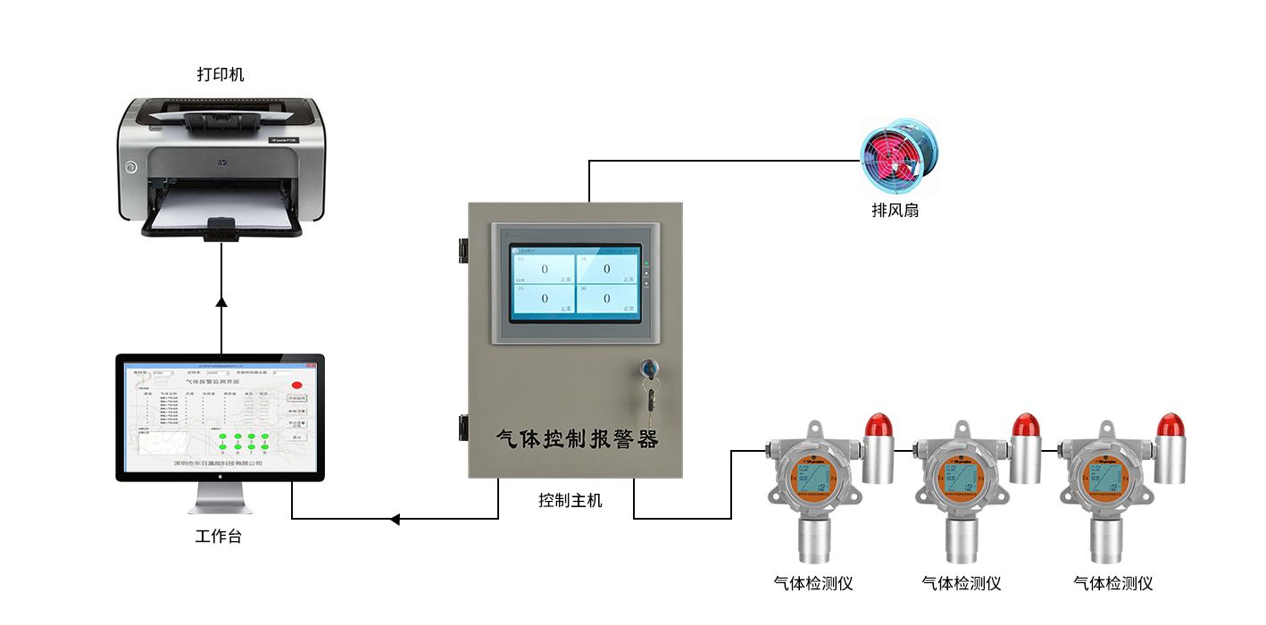 一氧化碳检测仪将会探测到工厂内一氧化碳浓度传输到控制系统上,一旦工厂内一氧化碳浓度达到上限报警值,控制系统就会发出声光报警, 并输出高限报警信号以启动排风扇或者现在监控安全人员采取更有效的措施,降低现场的一氧化碳浓度。如果一氧化碳浓度检测仪器探测到气体浓度持续上升,并达到高限报警值, 那控制系统就会输出高限报警信号(脉冲信号)以启动紧切断电磁阀,切断气源。